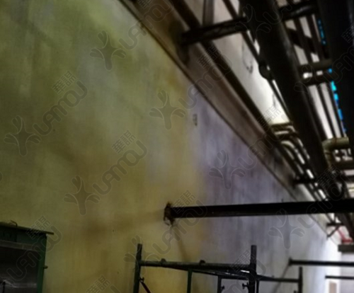 改善前 水會從壓機頭擋料板側(cè)邊濺出,不能全部接到節(jié)水盤中,不符合環(huán)保污水不落地政策。